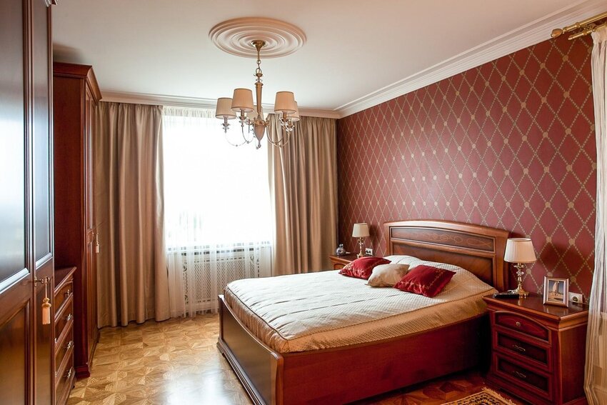 Оформление спальни размером 14 кв. м возможно произвести и в темных тонах. Для того, чтобы помещение в этом случае не казалось маленьким, одна из стен оформляется в светлых оттенках.