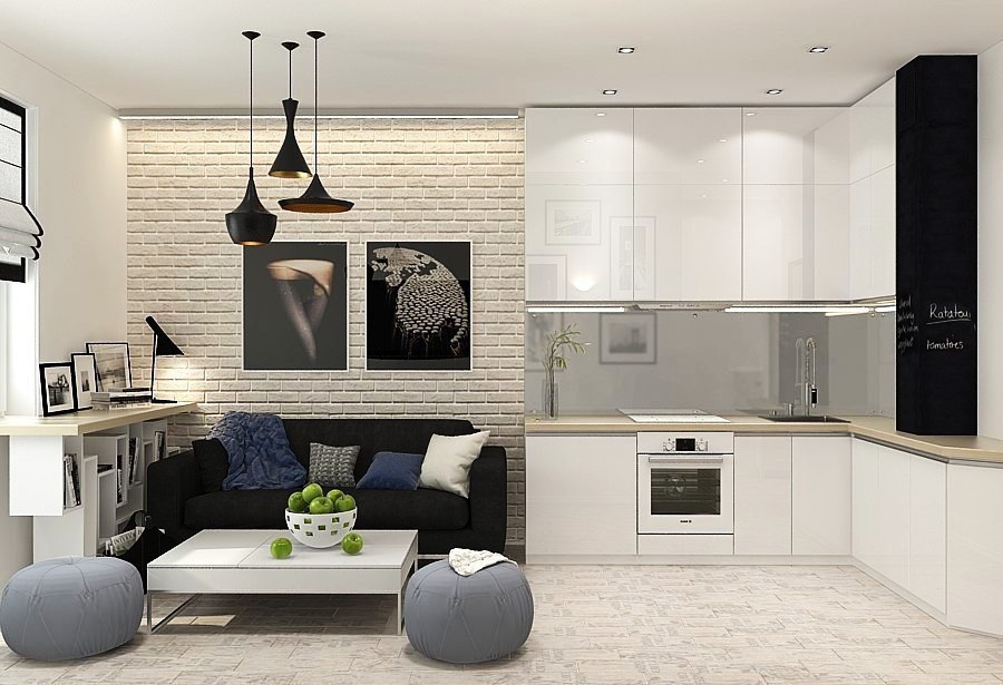 Что касается диванов, то для студийного варианта подойдут прямые модели и сделанные углом. Табуреты редко используются в комплектации с обеденным столом.