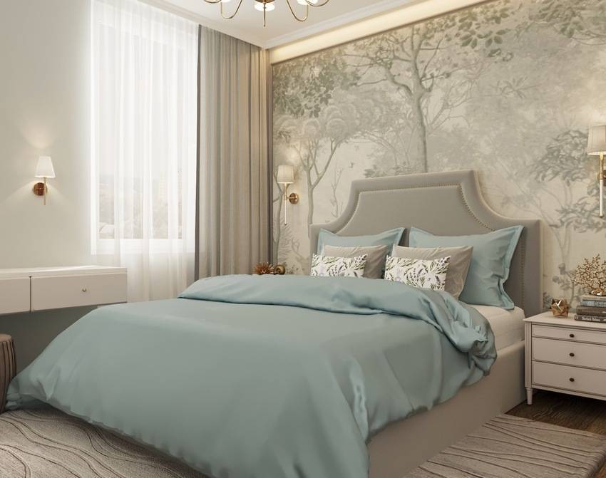 Светлая цветовая палитра — универсальное решение, подходящее спальням любых форм и размеров.