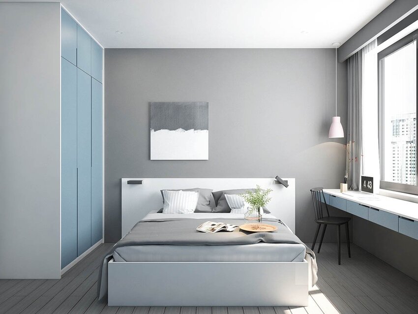 Для спален, окна которых выходят на южную сторону, нужно использовать холодные цвета, например, светло-серый или мятный. Допускается сочетание холодных тонов с теплыми, помогающими сделать спальню более уютной.