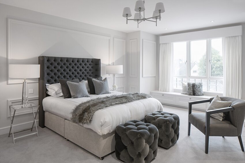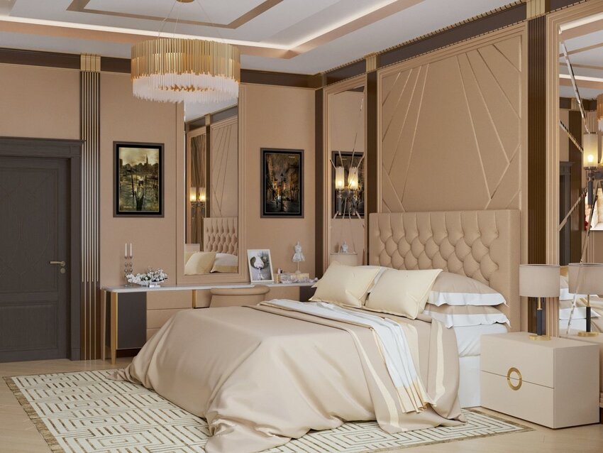 При этом важно разбавлять монохромность и однородность интерьера, чтобы избавиться от эффекта стерильности, делающего спальню неуютной. Для этого используются акцентные цвета, текстиль с рисунками и пр