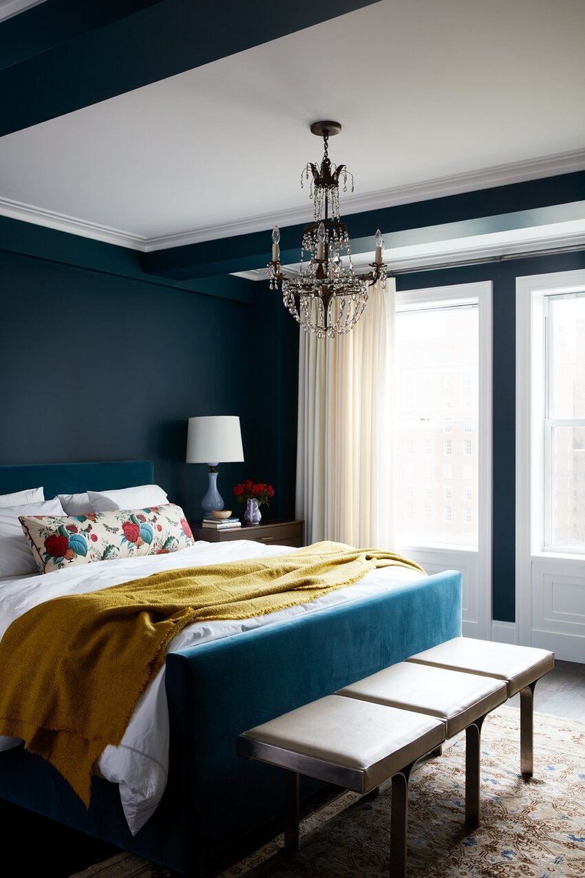 Синий цвет и его оттенки традиционно считаются наиболее подходящими для спальной комнаты. Он служит хорошим фоном для дополнительных ярких цветовых элементов