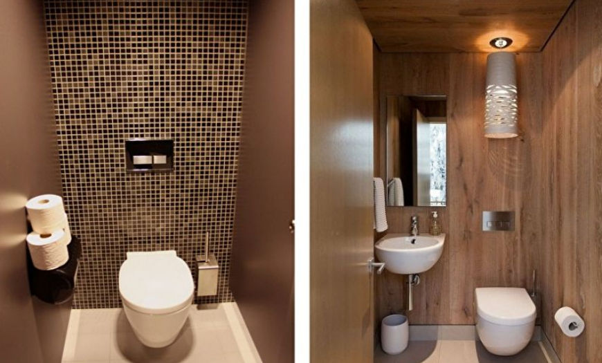 Комбинация двух отделочных материалов часто встречается в интерьерах маленького туалета без ванны. Часто встречаемые комбинации: