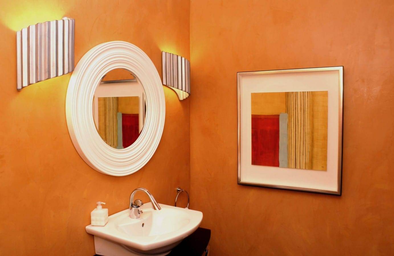 Туалет с картинами смотрится стильно, однако произведения искусства должны быть тщательно подобранными и гармонировать друг с другом, иначе дизайн будет выглядеть неэстетично. Лучше всего использовать много мелких картин, развешанных симметрично друг другу (одна под одной) или в хаотичном порядке.