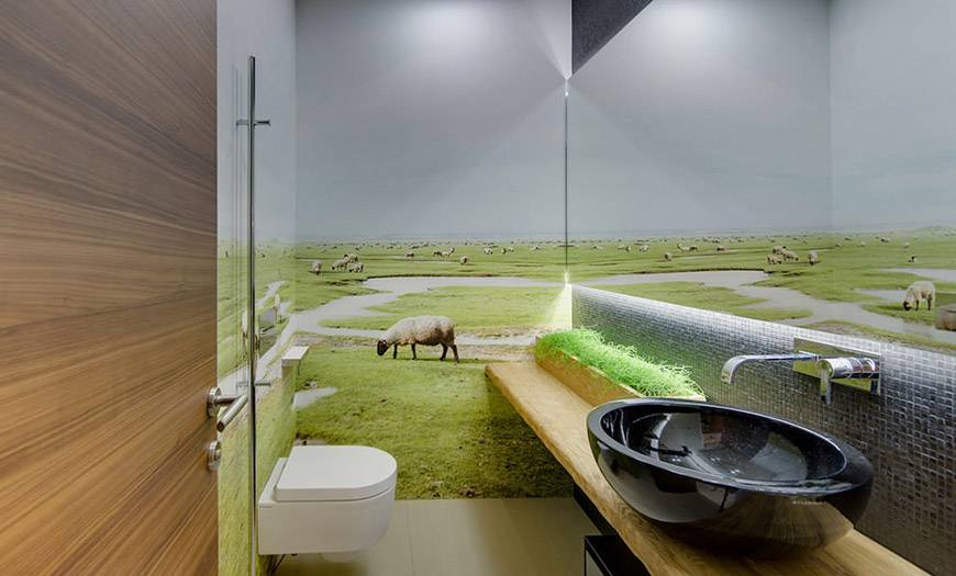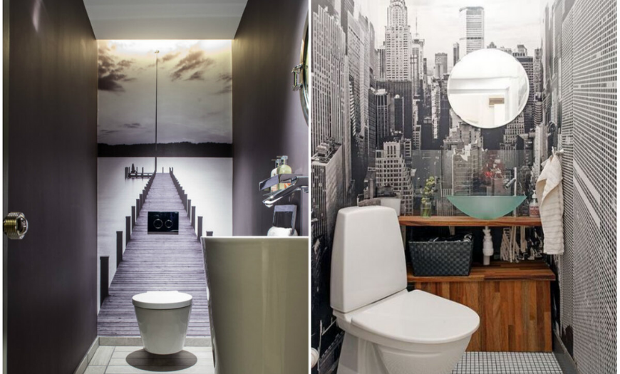 Фотообоями можно выделить одну или две стены туалета на однотонном фоне нейтральных обоев без рисунка. Подойдут изображения исходя из стиля интерьера, например, для морского стиля подойдет изображение волн, пляжа. Это могут быть пейзаж, реки, морские животные, горы.