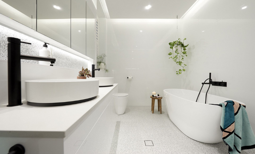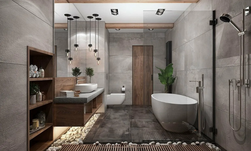 - модерн – это классика, переходящая в минимализм. Применяются прямые линии, современные модели сантехники, глянцевые оттенки. Стоит отметить, что благодаря особому расположению осветительных приборов визуально размер комнаты увеличивается.