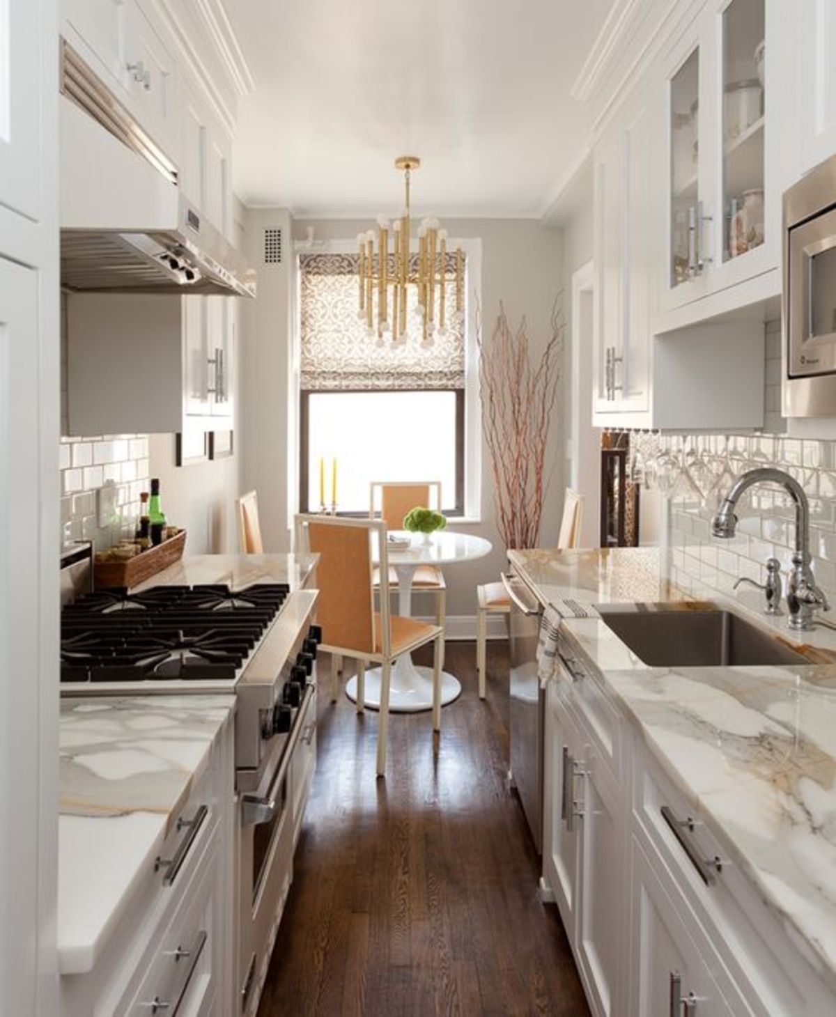 Однако есть варианты размещения, которые практически идеально впишутся в дизайн длинной узкой кухни: