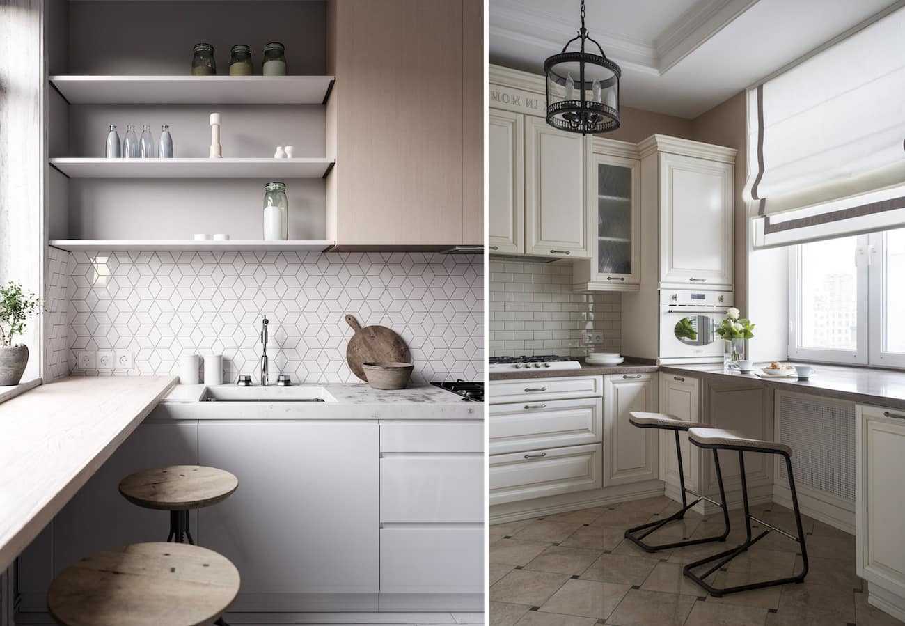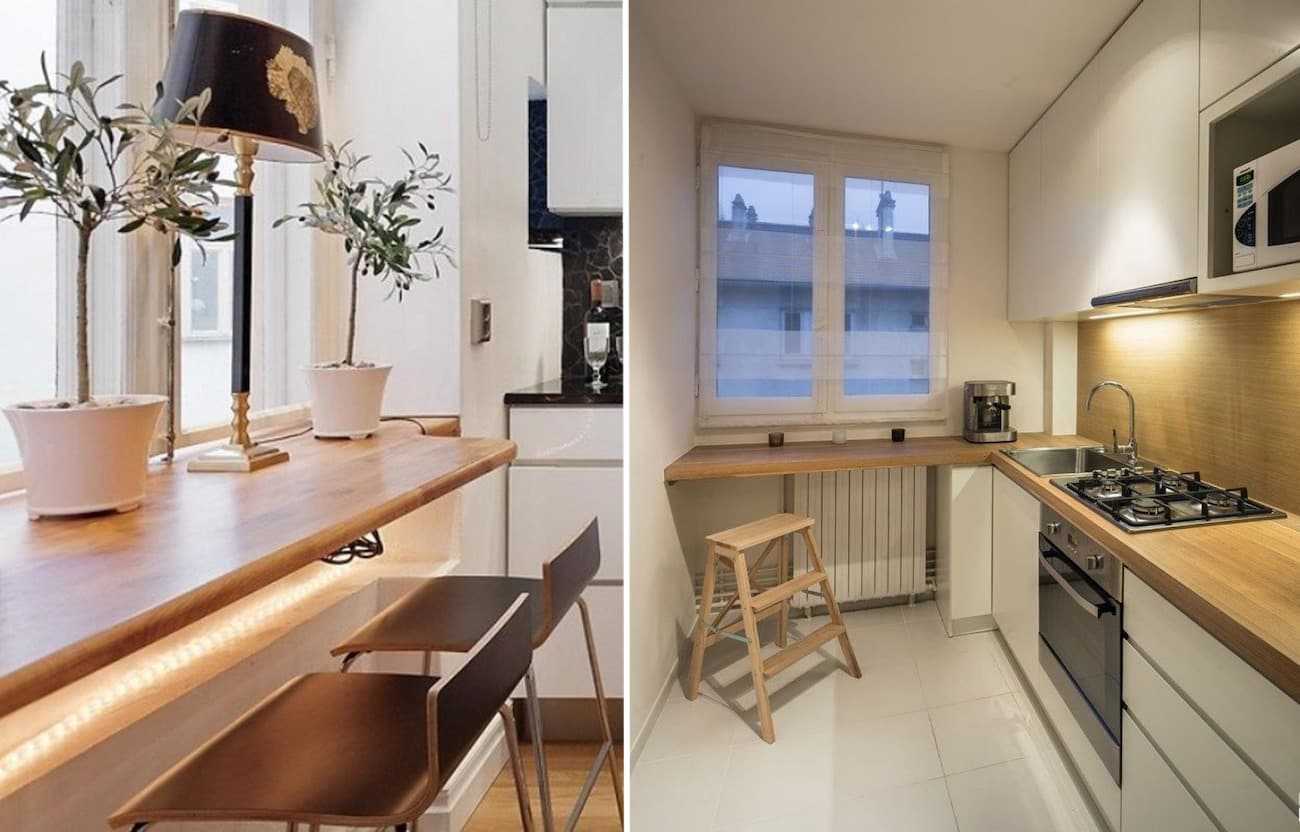 Все чаще роль барной стойки исполняет подоконник, который облицовывают прочным материалом и при необходимости делают более широким. Таким образом дизайн маленькой кухни 2020 становится более привлекательным и удобным.
