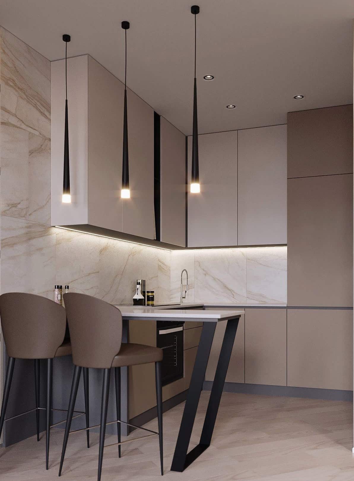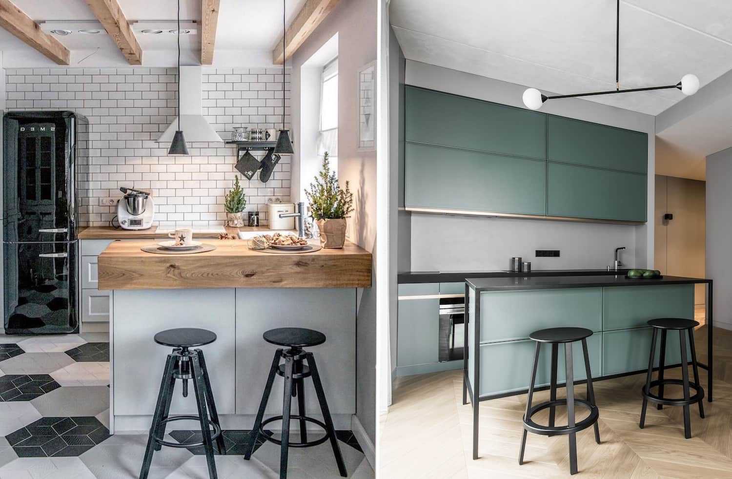 Установка барной стойки — оптимальный выбор для узкой кухни, где для обеденного стола не остается места. В такой ситуации небольшую барную стойку оборудуют у стены с окном, для удобства можно сделать ее откидной.