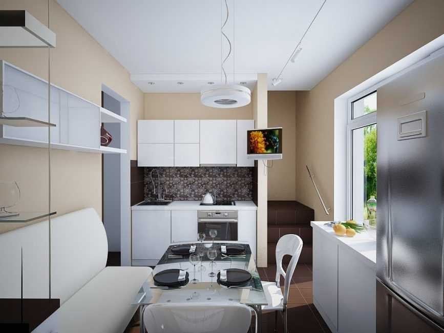 Дизайн узкой кухни с диваном. Разделение помещения на зоны