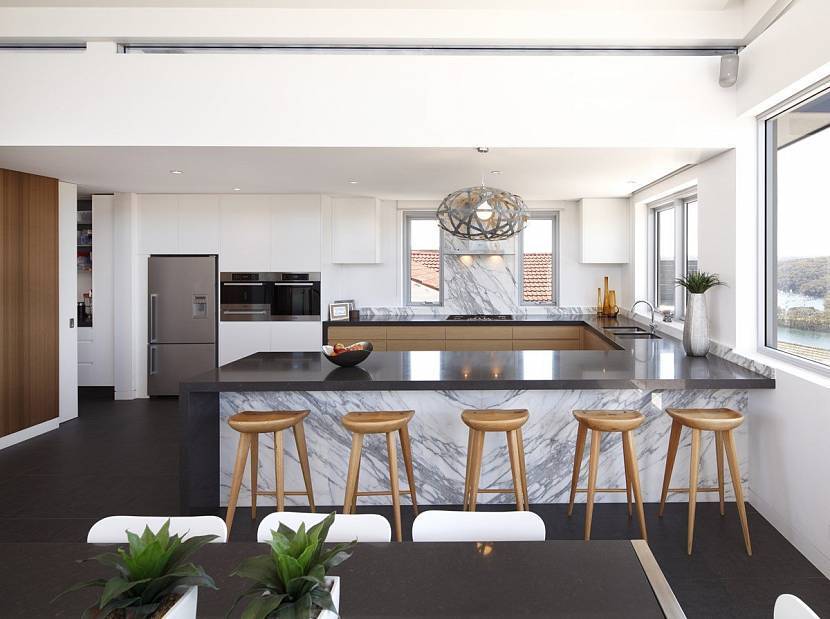 П-образная. Уместна в квадратных кухнях. В таких комнатах раковину, столешницу или обеденную зону желательно расположить рядом с окном.