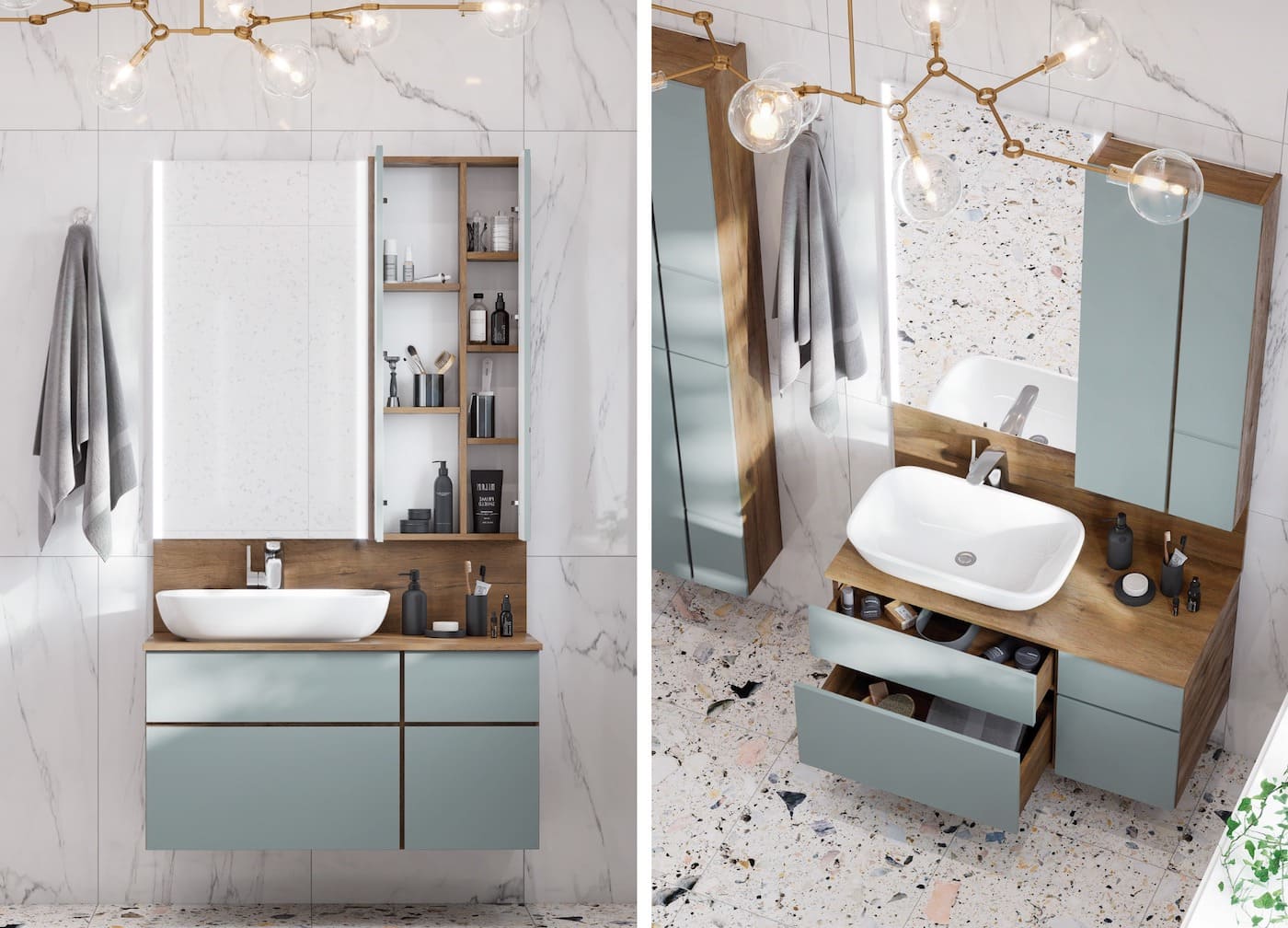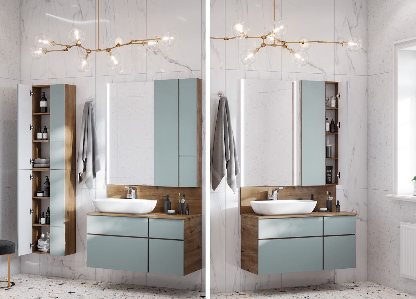 Система хранения в маленькой ванной должна быть максимально компактной, но вместительной. Чтобы сэкономить место, совместите несколько функций в одном изделии: тумба под умывальник + тумба, зеркало + ящик.