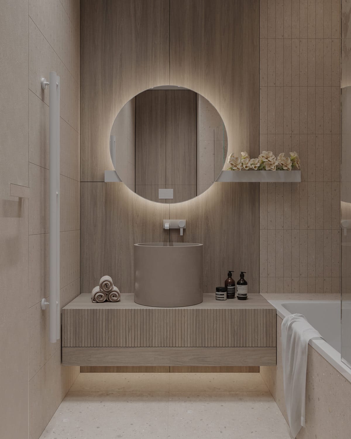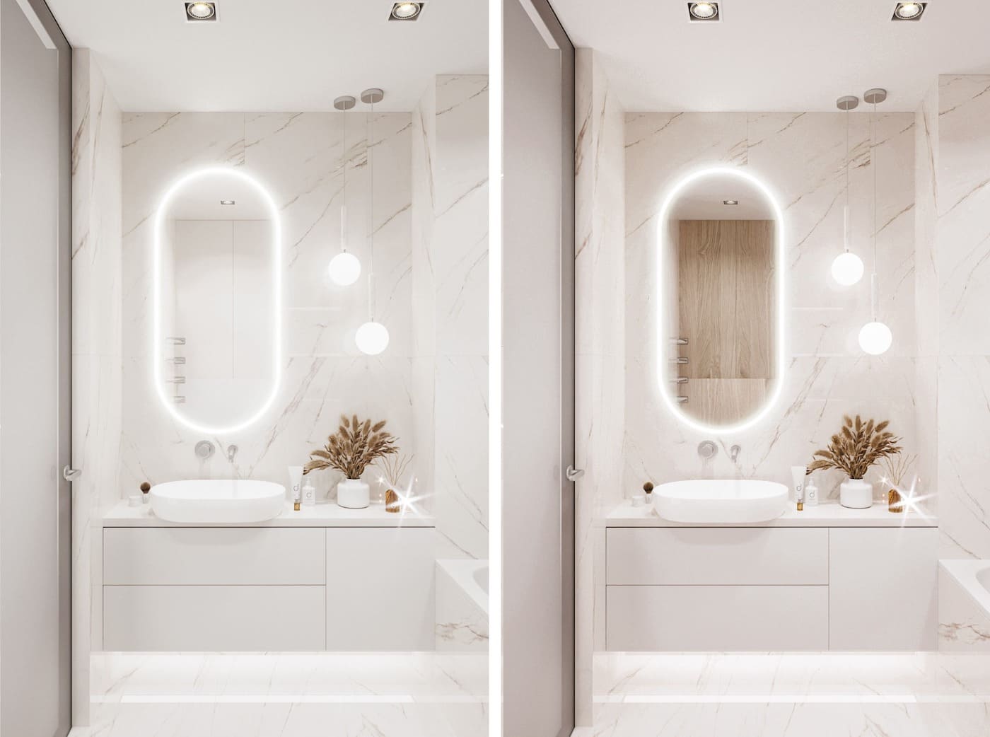 - Без углов. Этот способ подразумевает создание вокруг ванной полукруглой ниши. Компенсировать уменьшенное пространство поможет большое зеркало.
