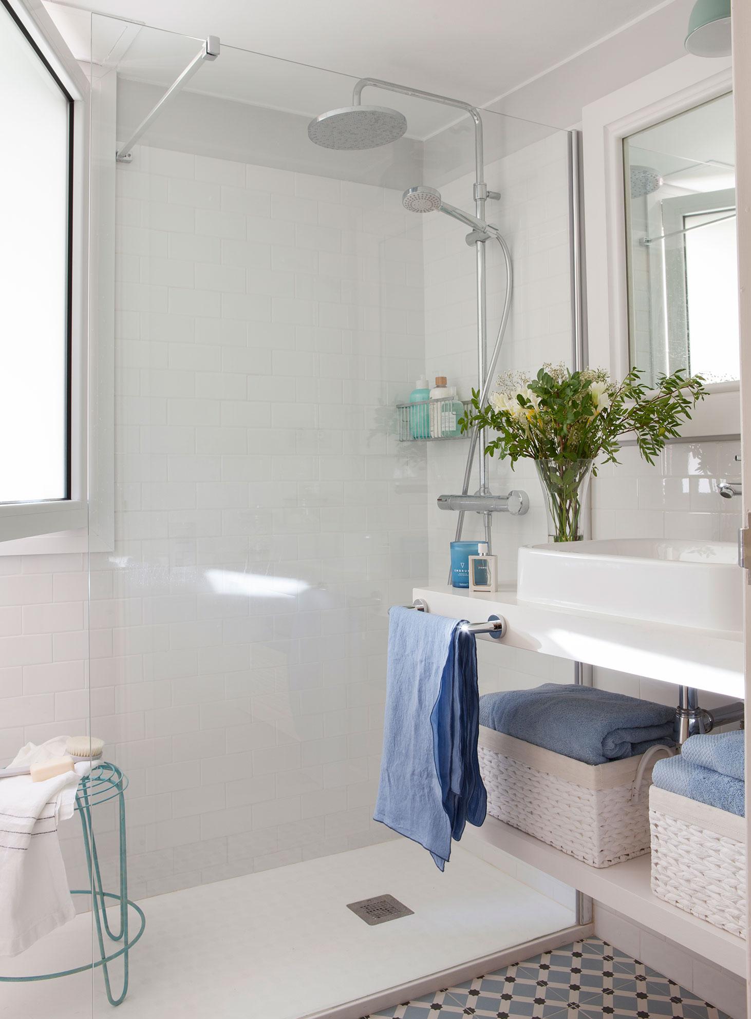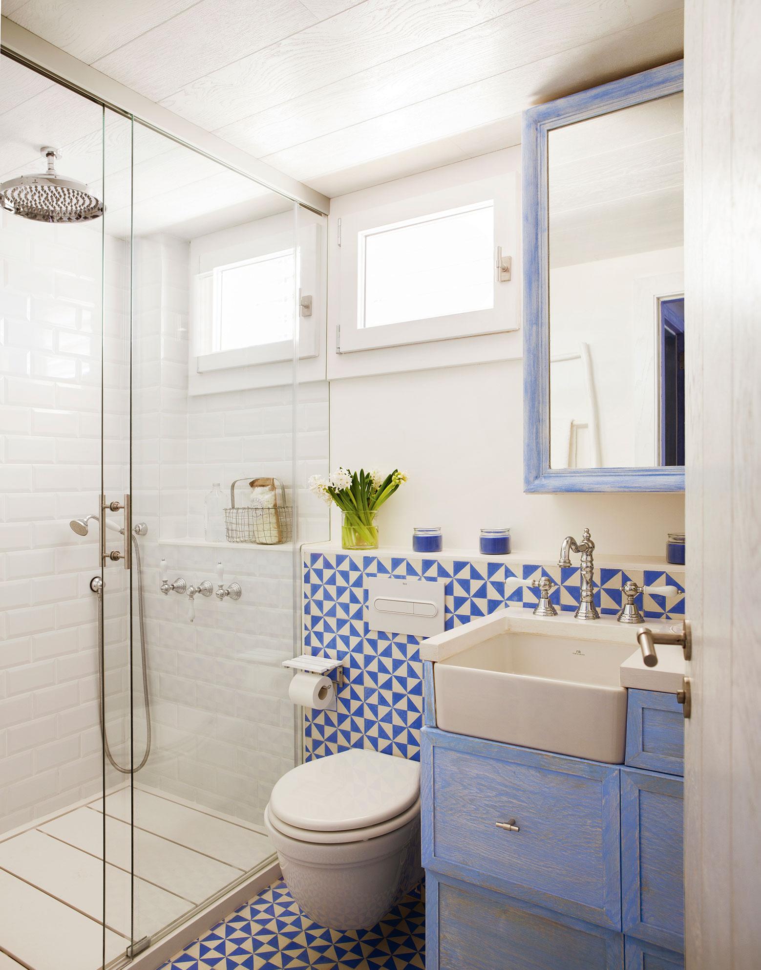 Кирпичная форма используемой здесь керамической плитки выглядит очень стильно. Дизайнеры выбрали классическую матовую плитку белого цвета, разбавив ее образцами насыщенного синего в зоне душевого поддона. Этот прием способствует пробуждению, он словно активизирует невидимые точки в мозгу человека.