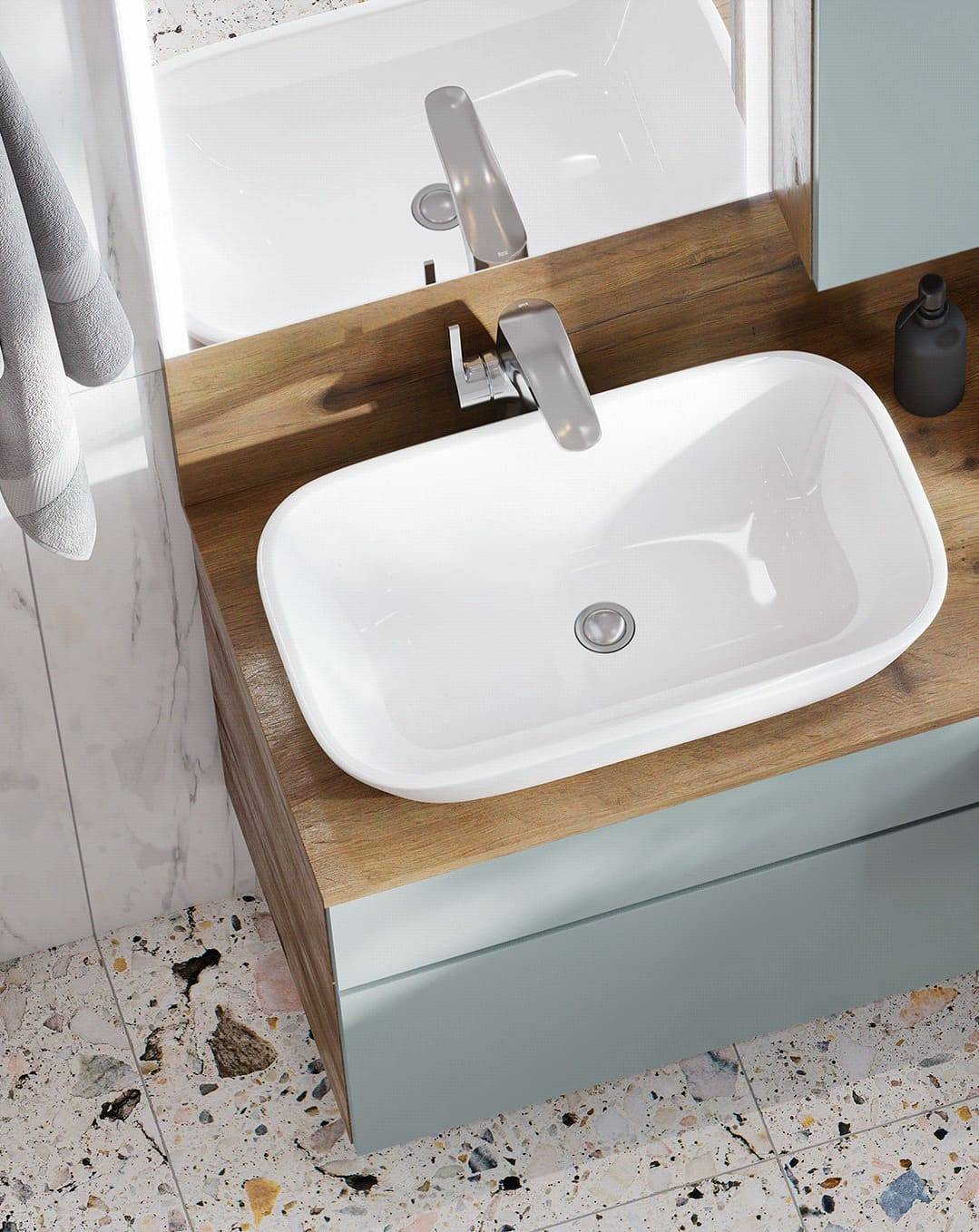 Раковину тоже следует подвесить, на небольшой площадке над шкафом или стиральной машиной, соединяя одновременно несколько зон. Устанавливается в одном из двух мест: возле ванны, чтобы не ставить второй смеситель. Или возле туалета, если в ванной есть душ.