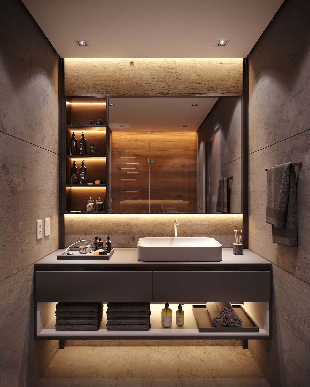Также стоит подсветить полки в ванной светодиодными лентами. Благодаря им у вас есть возможность найти то, что вам нужно в кратчайшие сроки.
