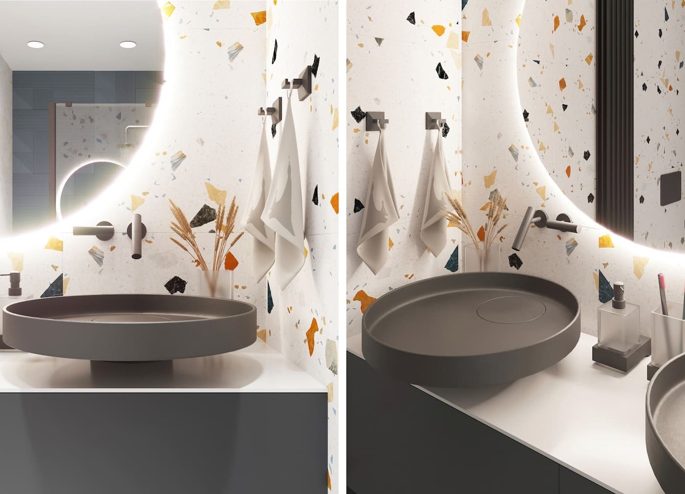 Серый, имитирующий цвет металла, незаменим при создании дизайна ванной комнаты 3 квадратных метра и воплощении современных идей 2021. Очень эффектно будет смотреться в окружении белой керамики, зеркал, хромированной фурнитуры, что видно на фото.