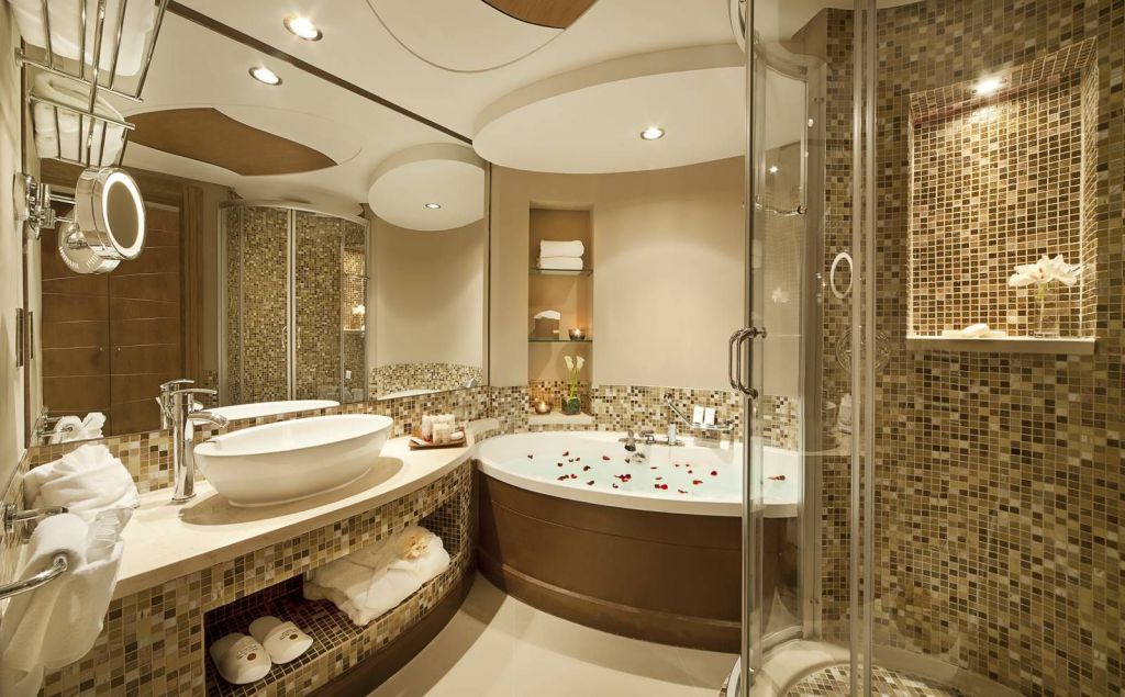 Для классического санузла в стиле ампир или барокко правильным решением будет приобретение овальной глубокой ванны с ножками в виде «львиных лап». Также величественно будут смотреться небольшие округлые бассейны, расположенные в углублениях подиумов.