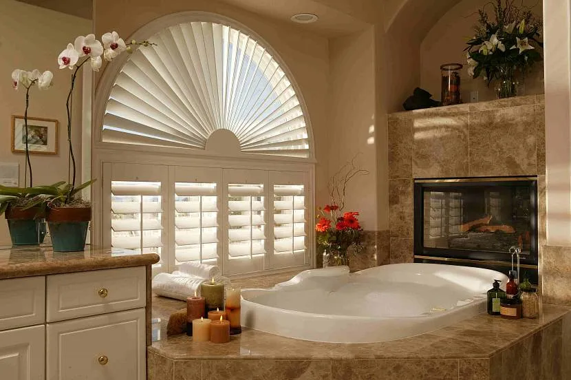 Ванная комната с арочным окном из деревянной рамыИсточник randolphsunoco.com