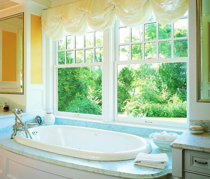 Отдельно стоит коснуться темы выбора сантехники при наличии окна в ванной. Не секрет, что на сегодняшний день можно подобрать самую разнообразную по форме и конструктивному исполнению сантехнику. Удачным решением станет совпадение геометрических форм ванной, душевой кабины и прочей сантехники с окном. Прямоугольные, овальные, круглые ванны будут смотреться гармонично в сочетании с аналогичными линиями окон, образуя совершенное пространство.