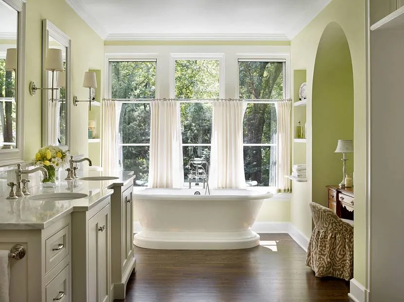 Витражи, драпированный тюль, тяжелые занавески и даже дорогие гардины —оформление для классического дизайна ванной с оконцем.