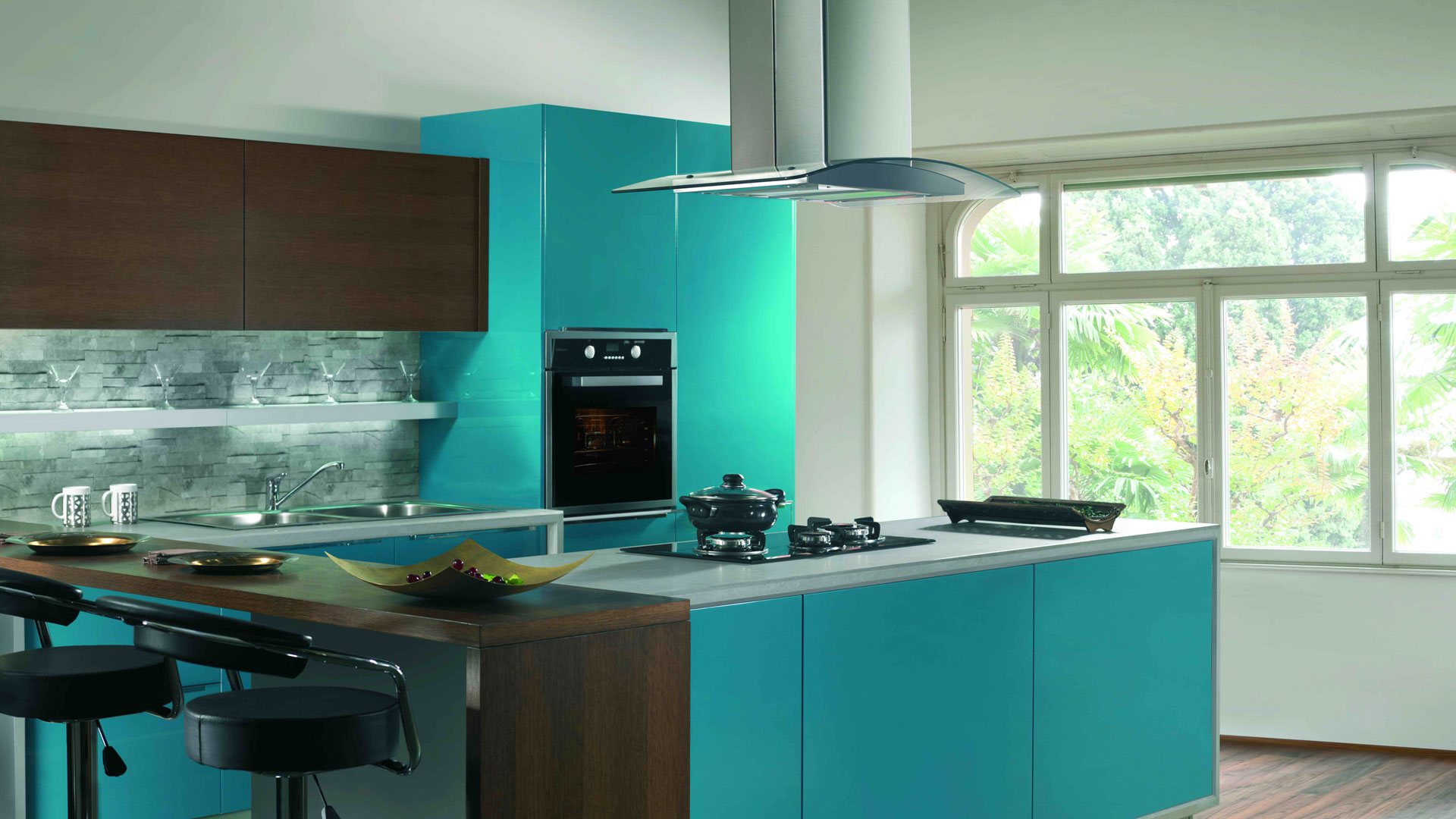 В современном дизайне есть простор для фантазии. Нередки сочетания теплых и холодных оттенков и материалов – дерева и голубого цвета.