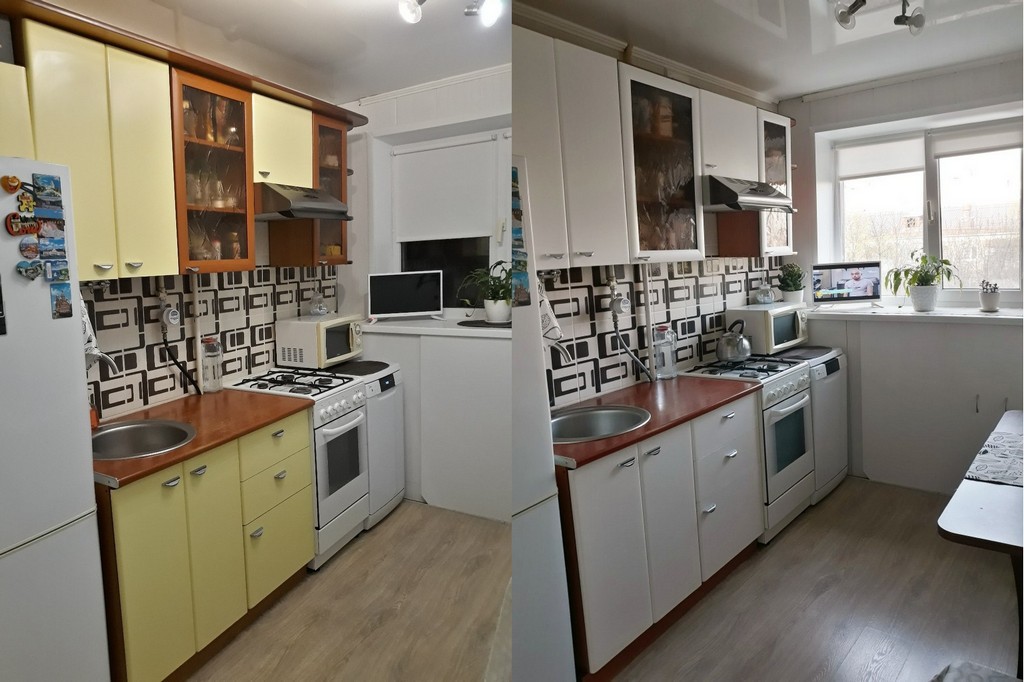 Вот такой получилась обновленная кухня Натальи. По-весеннему жизнерадостный цвет дополнили яркие обои. Никто уже не вспоминает про завёрнутые края ламината и унылый вид мебели