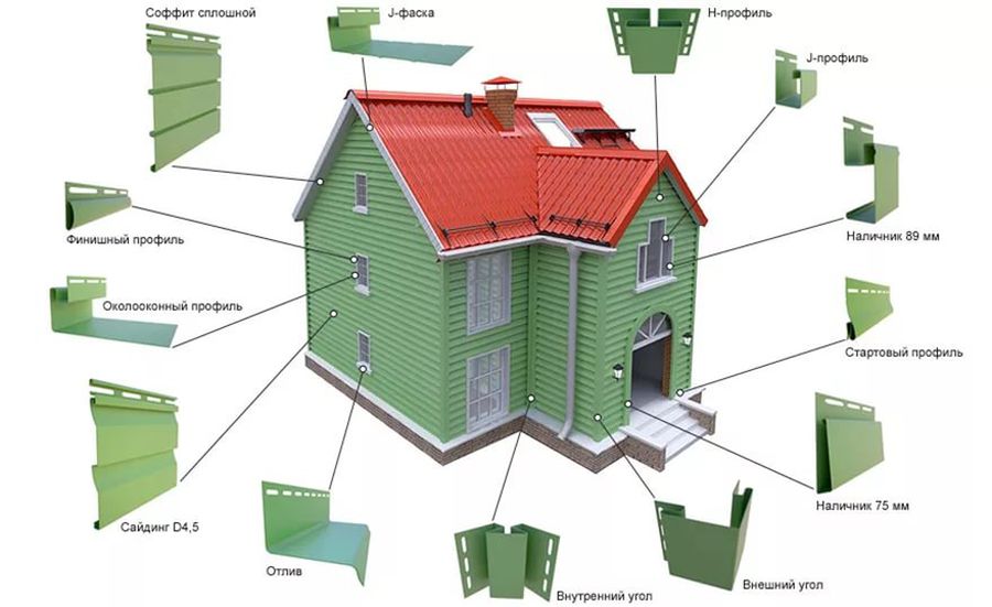 Наиболее популярные варианты облицовочного материала – виниловый и металлосайдинг – продаются в комплекте с набором похожей фурнитуры. Способы использования отдельных элементов могут различаться в зависимости от ситуации.