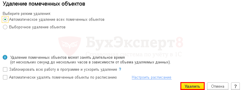 Шаг 2. Выполнить операцию удаления по обработке Удаление помеченных объектов: раздел Операции – Сервис – Удаление помеченных объектов.