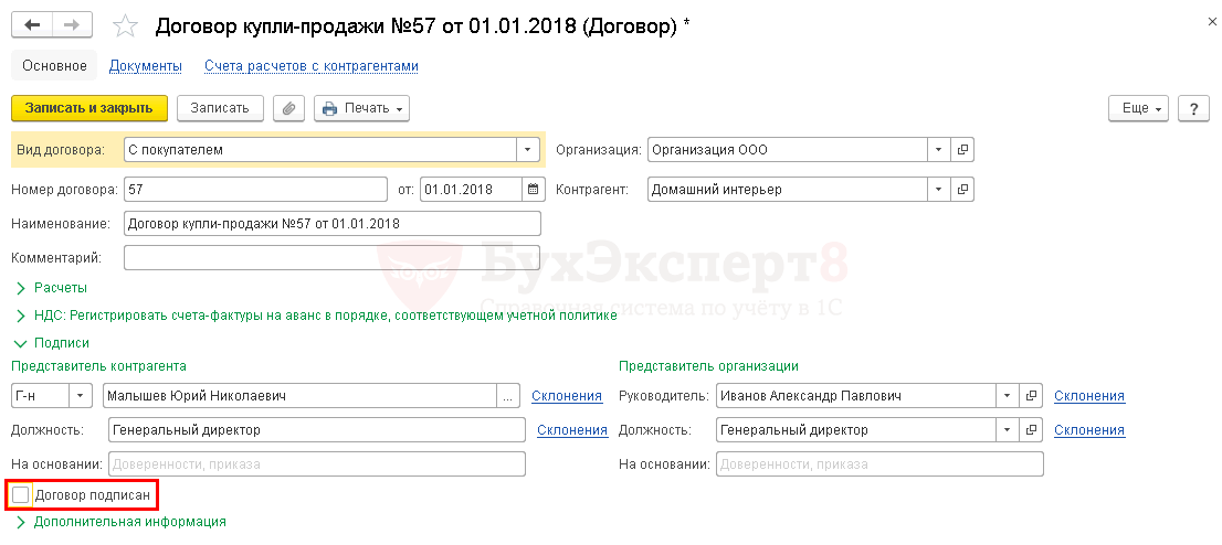 - представители контрагента и организации – поля Группы Подписи: Представитель контрагента и Представитель организации из карточки договора с контрагентом справочника Договоры; PDF