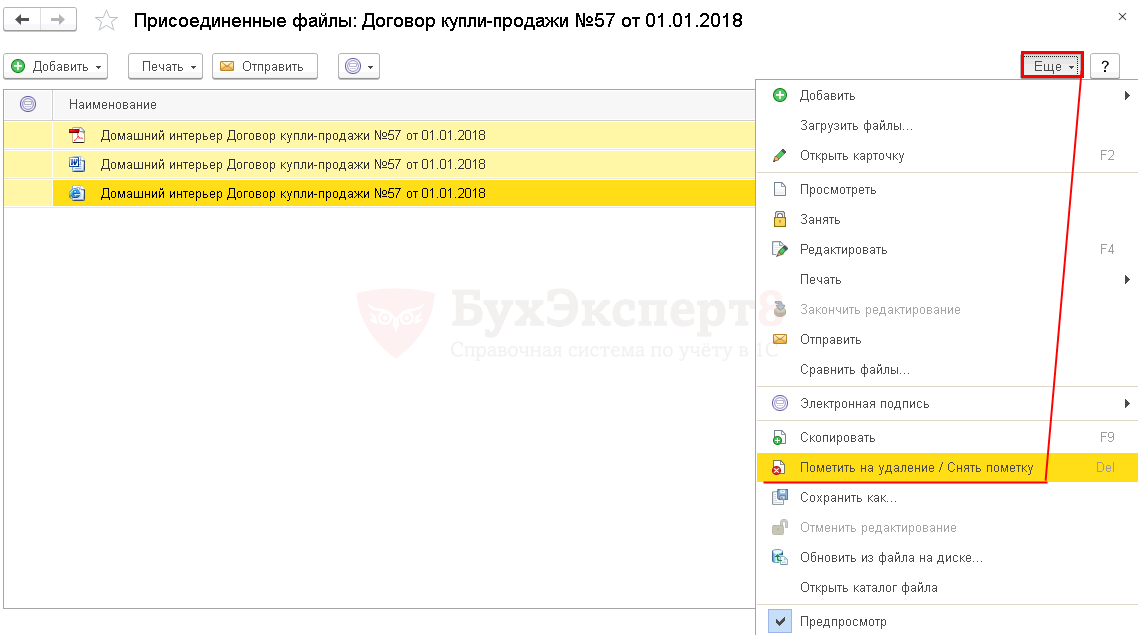 Шаг 1. Пометить присоединенные файлы на удаление по кнопке ЕЩЕ – Пометить на удаление/Снять пометку.
