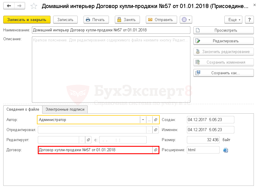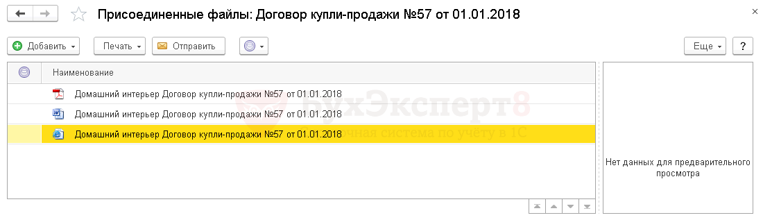 В результате выполненных действий, удалятся файлы формата PDFи RTF. Файл формата HTML не удалится, поэтому веб-формат лучше не выбирать для прикрепления к справочнику Договоры.