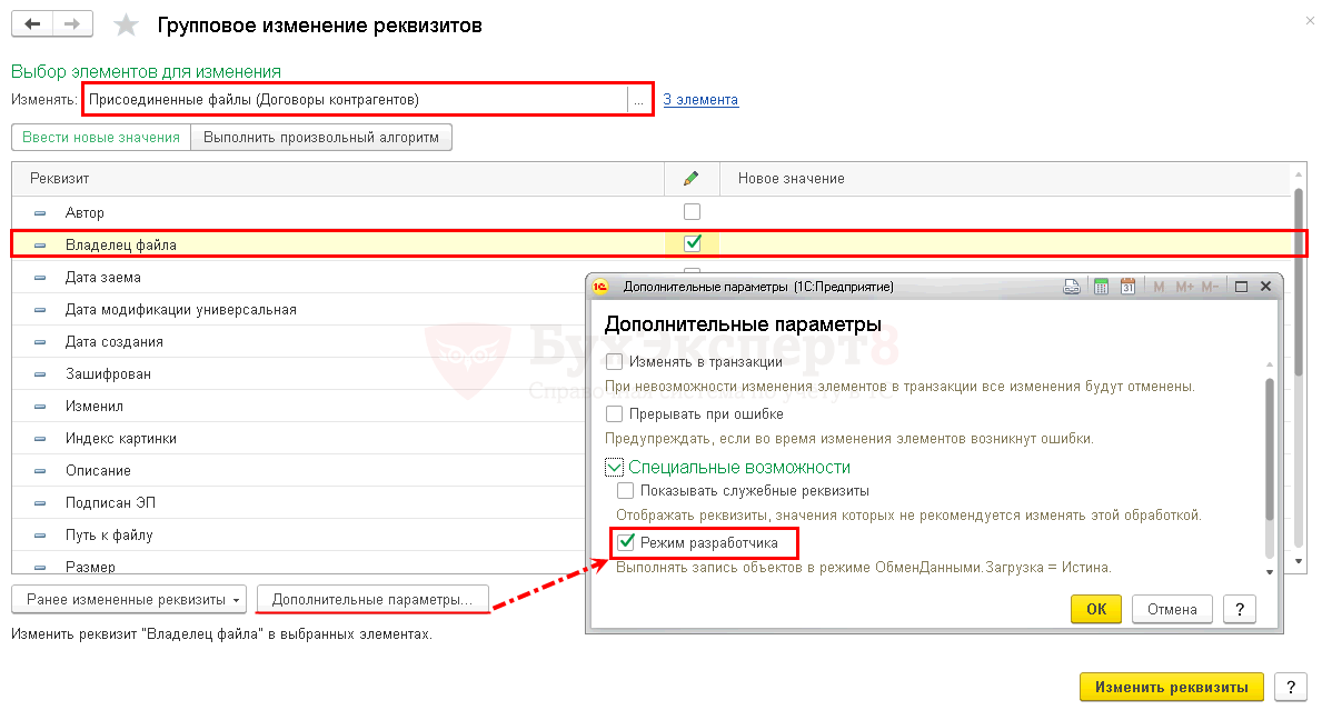 Шаг 2. Выбрать для изменения справочник Присоединенные файлы (Договоры контрагентов) и в форме настройки дополнительных параметров выставить флажок Режим разработчика. В поле Владелец файла выставить флажок.
