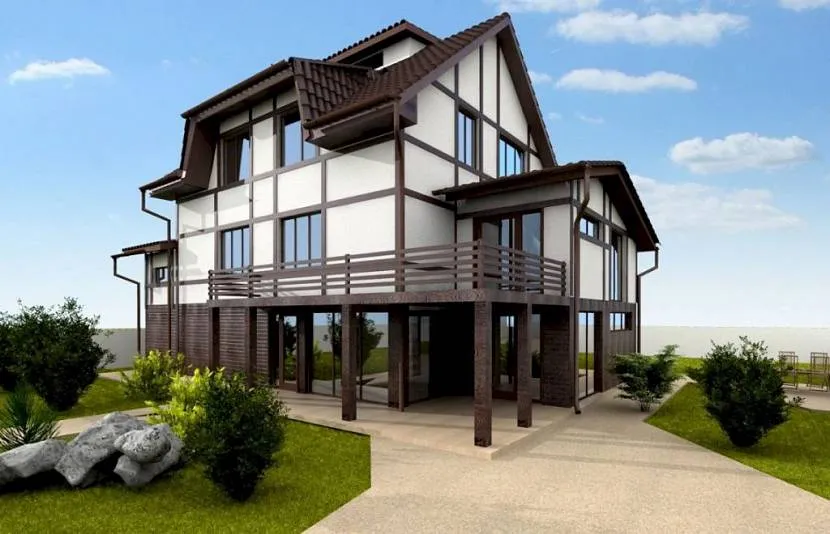 Так, часто можно увидеть проекты, в которых отделка фасада дома в стиле фахверк заключается в размещении балок исключительно как декоративных элементов, которые оформляют балконы, окна, зону второго этажа и тому подобное. При этом каркас будто бы зависает в воздухе, что выглядит странно и непонятно.