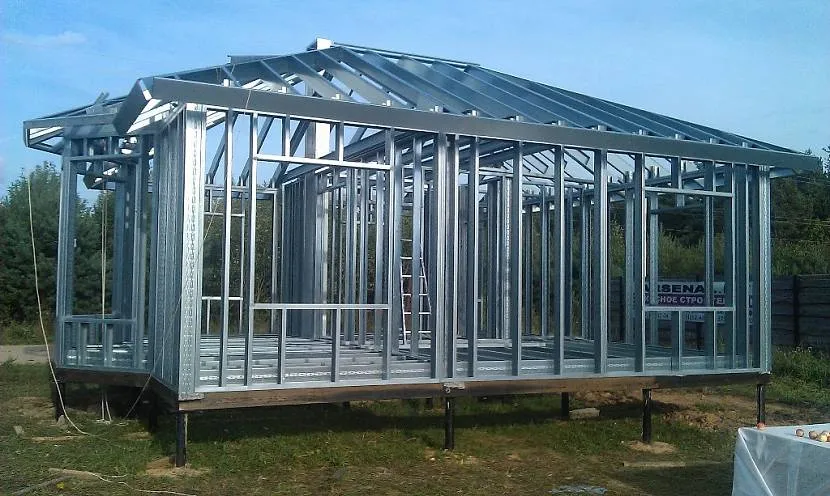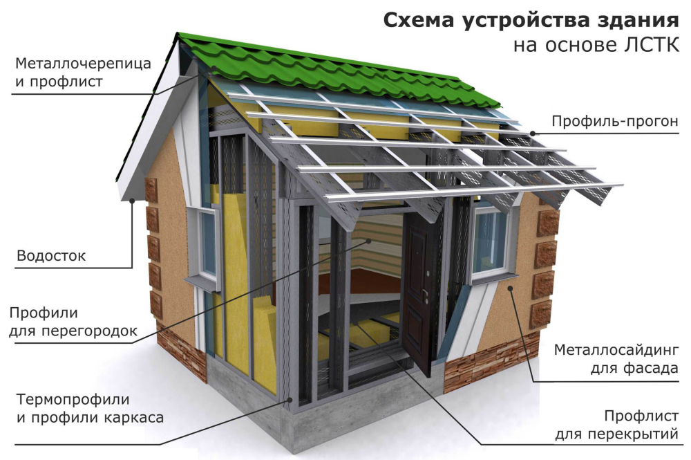 Основу ЛСТК-дома составляет стальной каркас, собранный из тонкостенных профилей. Несмотря на отличный показатель прочности, такая конструкция весит немного, что позволяет использовать недорогой тип фундамента (например, ленточный или свайно-винтовой). После того, как каркас собран, он обшивается слоями утеплителя и листами гипсокартона. Снаружи укладываются слои паро- и гидроизоляции, затем строение покрывается любым отделочным материалом (искусственный камень, блок-хаус, сайдинг или штукатурка). Внутри дома также возможно использование любого отделочного материала: штукатурки, краски, обоев или кафеля. Межэтажные перекрытия и каркас крыши тоже делаются из ЛСТК.