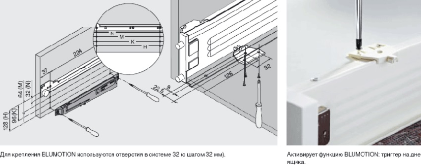 Данный элемент важно установить строго по схеме таким образом, чтобы язычок выглядывал за край кухонного ящика. Согласно схеме выполняется разметка, просверливаются отверстия, в которые вкручиваются саморезы для фиксации активатора