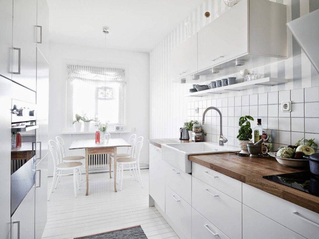 Кухня в скандинавском стиле, фото которой можно увидеть выше, не принимает беспорядок. И это прекрасно, потому что кухонная зона может быть использована с максимальной пользой. Особенностью этой кухни является отсутствие верхних шкафов — их заменяют элегантные открытые полки, которые создадут дополнительное ощущение простора.