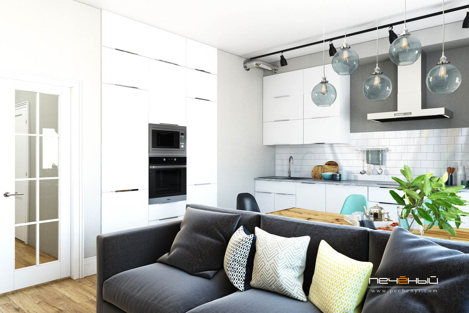 На фото сочетание белого дверного полотна с деревянным полом в кухне и гостиной.