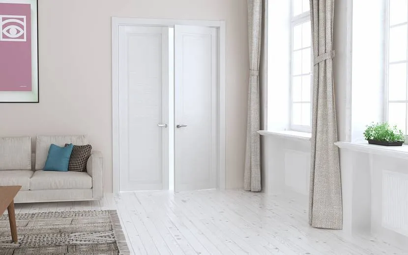 Если мебель и отделка белоснежно холодная или теплая серая, то и двери тоже должны быть такими же.