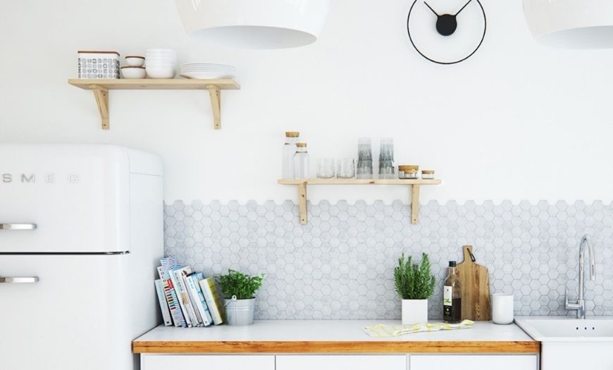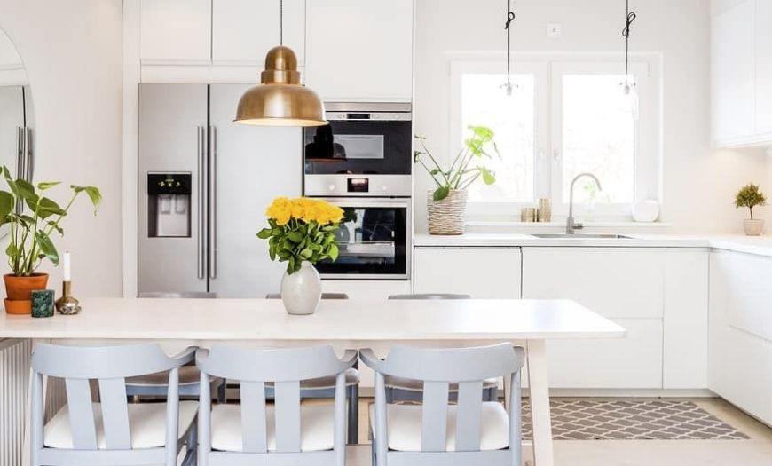 В истинном скандинавском стиле, если у вас есть полностью белая тематическая кухня, лучший способ добавить цвет- это внедрить различные предметы яркой мебели. Например, выбрать подходящий по цвету холодильник, комнатные растения или яркие кофе-машины, которые добавляют оттенок цвета, не выходя за его пределы.
