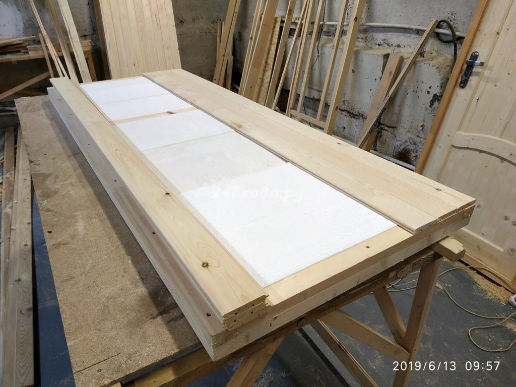 - Закладываем утеплитель, изоляционный слой внутрь будущей двери.