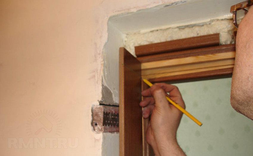 Вертикальные доборы замеряются и устанавливаются после закрепления верхней перекладины. По угольнику, приложенному к торцу дверной коробки, устанавливается разница в высоте, полученные размеры переносятся на разметку. Доски боковых откосов желательно делать на 1–2 мм длиннее, чтобы была возможность точно подогнать деталь наждачным бруском.