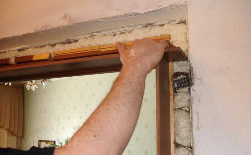 Боковины примеряете, вставляете верхушку. Если край получился на одном уровне с основной стеной, а щели возле дверной коробки минимальны — все сделано правильно. Если есть огрехи, их исправляем.
