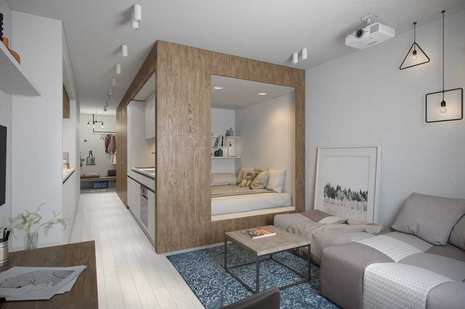 Отличным решением для отдельно выделенной спальной зоны в однушке или студии, станет подиум или ниша, в которую можно полностью или частично установить кровать. Для отделения пространства, углубление оформляют занавесками или раздвижными перегородками.