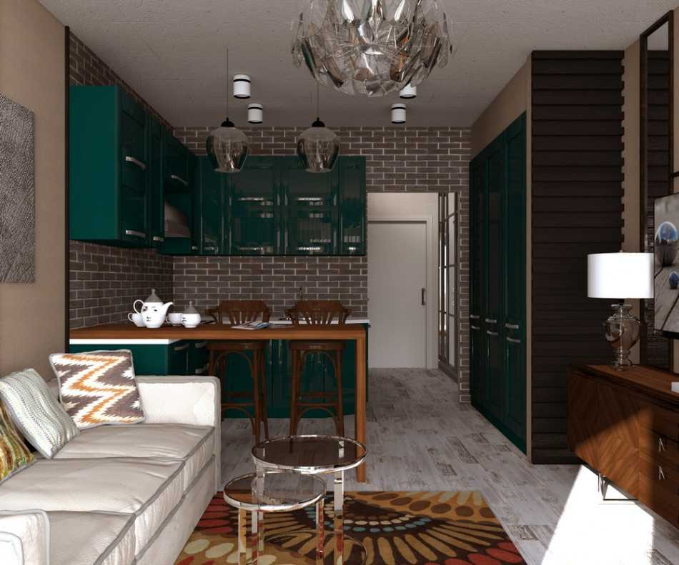 На фото дизайн совмещенной кухни-гостиной в интерьере евродвушки 36 кв. м.