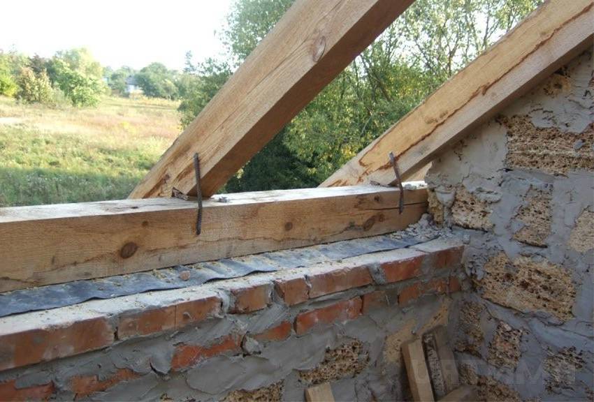Не забудьте сделать гидроизоляционный слой под мауэрлат. Без него срок службы конструкции заметно сократится. Для этой цели хорошо подойдет рубероид или другой подобный материал.