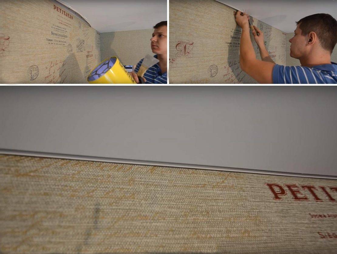- Полотно заправляют в багет и устанавливают плинтус.