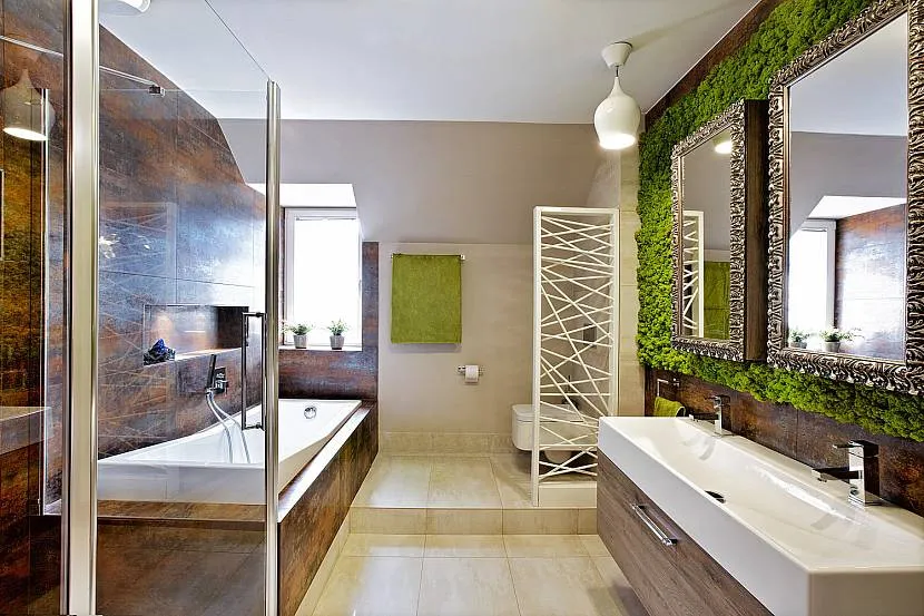 Эко-стиль в дизайне ванной комнаты допускает использование имитирующих материалов. Например, хорошо будет смотреться керамогранитная плитка «под дерево» в «мокрых» зонах, к тому же она значительно практичнее, чем дерево, даже обработанное специальными составами. Приветствуется также использование керамической плитки, а вне мокрых зон – штукатурка с последующим окрашиванием влагостойкими красками.