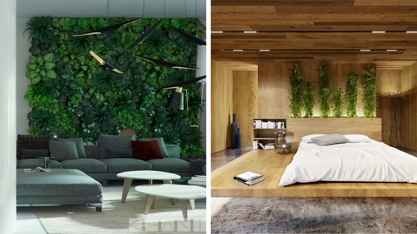 Лучший декор — комнатные растения. Чем больше зелени в помещении, тем органичнее выглядит дизайн. Потрясающе смотрится “живая” стена. Это конструкция из небольших каменных модулей, в которые посажены трава или мини-кусты. Издалека такая стена кажется сплошной — ячейки с посадками практически не видны.