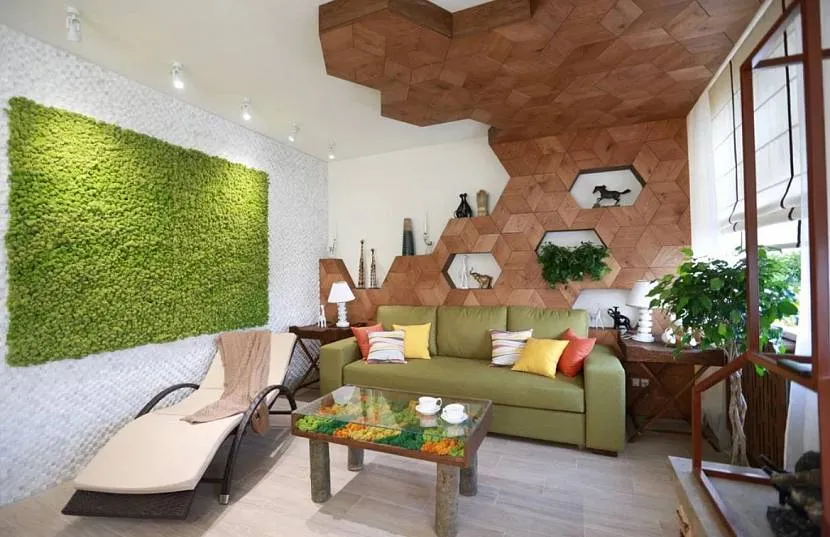 У любителей комнатных растений появляется уникальная возможность сделать увлечение узнаваемой чертой, характеризующей натуральный стиль. Живая озелененная стена – признак высокого класса природного стиля. Но придется вложить много сил, времени, денег. Оборудование состоит из специальной конструкции с посадочными ёмкостями, набора систем: оросительной, дренажной, осветительной, совокупная работа которых даст возможность росту растений. Глядя на зелень, получите не только эстетическое удовольствие, но и свежий, наполненный кислородом воздух.